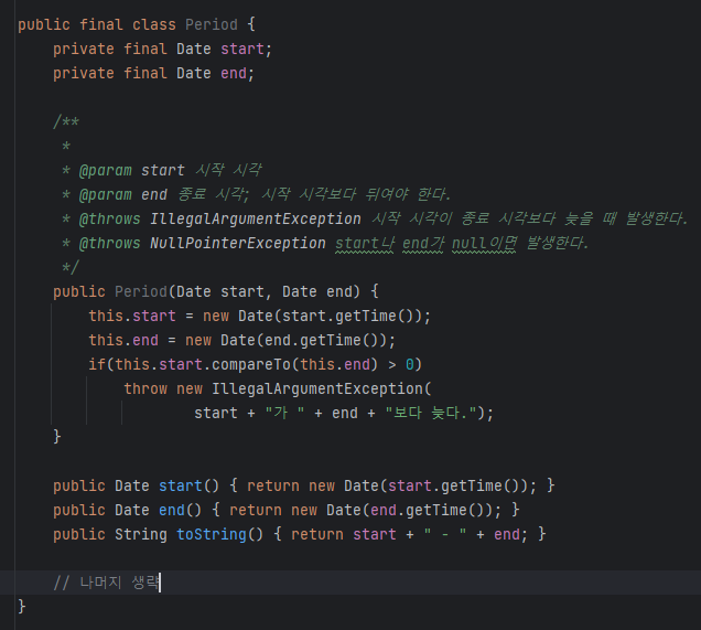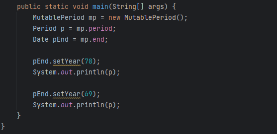 이제 이 참조로 얻은 Date 인스턴스들을 수정할 수 있으니 Period 인스턴스는 더는 불변이 아니게 된다.