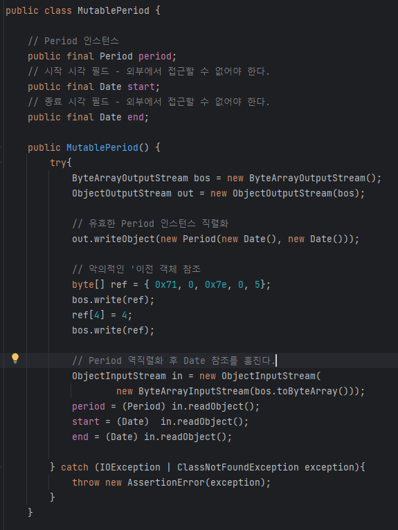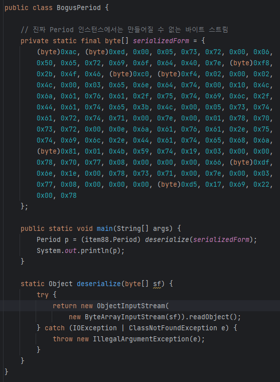 Period를 직렬화 할 수 있도록 선언한 것만으로도 시작날짜가 끝나는 날짜보다 더 미래인 클래스의 불변식을 깨뜨리는 객체를 만들 수 있다.