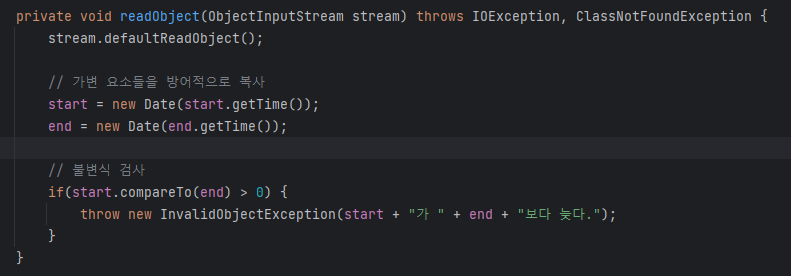 이 문제를 고치려면 Period의 readObject 메서드가 defaultReadObject를 호출한 다음 역직렬화된 객체가 유효한지 검사해야 한다.