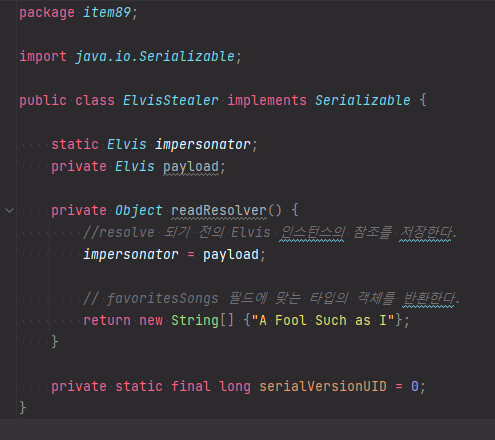 이 인스턴스 필드는 도둑이 숨길 직렬화된 싱글턴을 참조하는 역할을 한다.