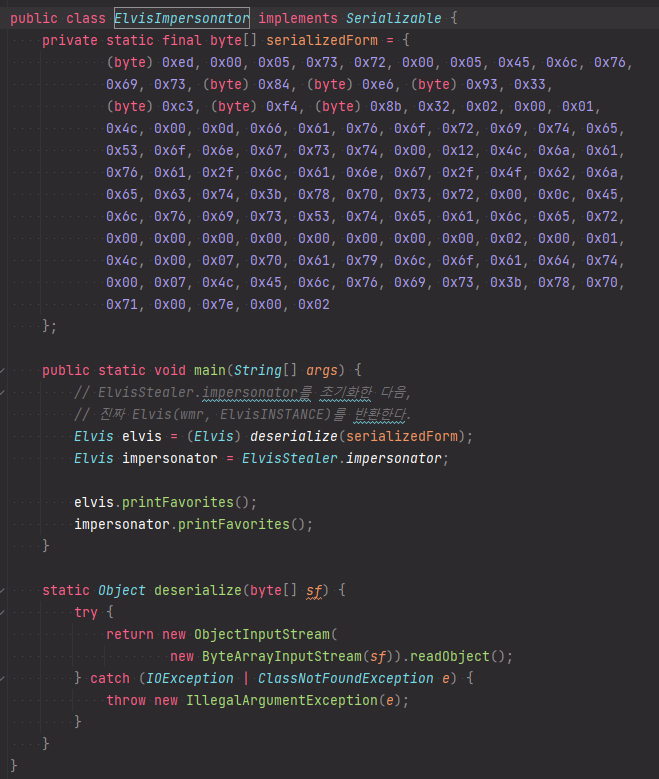 이해가 잘 안갔지만 Elvis의 favoriteSongs 필드가 String[]이 아닌 ElvisStealer 타입으로 만들어낸 바이트 스트림으로 가공하여 역직렬화시 ElvisStealer 객체를 포함하고 있어 그 객체의 readResolve가 호출된다고 일단 생각하였다.