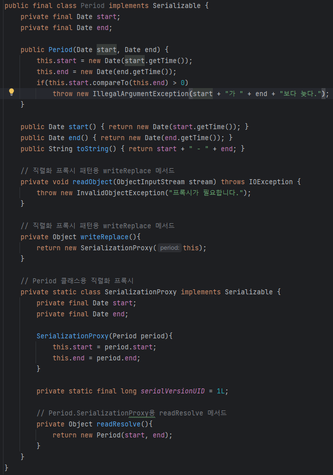 직렬화 프록시는 Period의 필드를 final로 선언해도 되므로 Period 클래스를 진정한 불변으로 만들 수 있다.