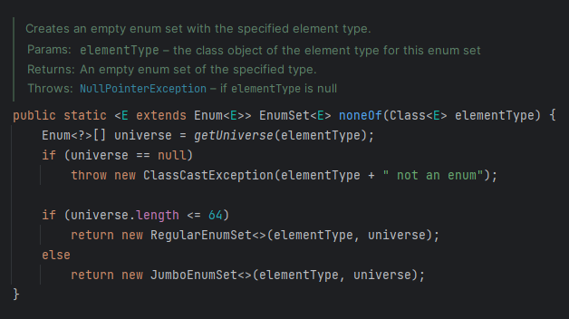 열거 타입의 원소가 64개 이하면 RegularEnumSet을 사용하고 그보다 크면 JumboEnumSet을 사용하는 것이다.