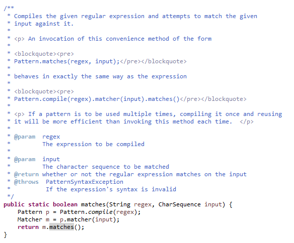 matcher(CharSequence input) : 대상 문자열이 패턴과 일치할 경우 true를 반환합니다.