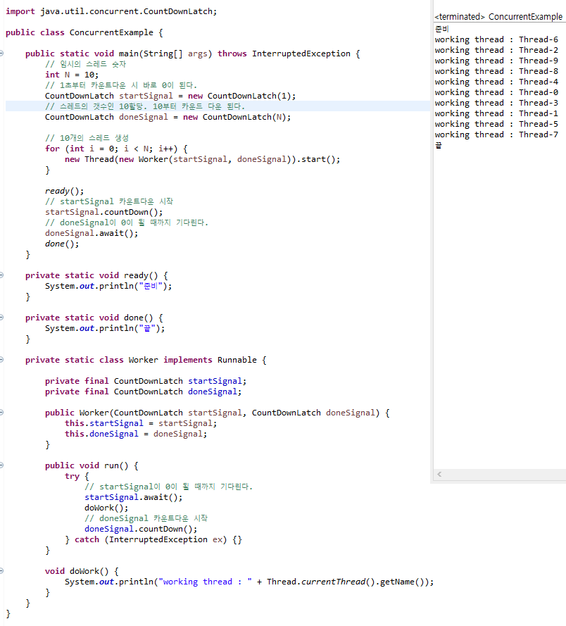 - 초기화할 때 숫자를 입력하고, await() 메서드를 사용해서 숫자가 0이 될 때까지 기다린다.