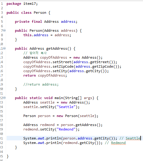 - 자신 외에는 내부의 가변 컴포넌트에 접근할 수 없도록 한다.