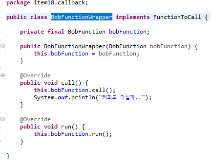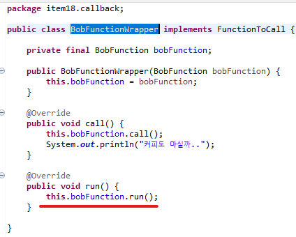 - 래퍼로 감싸고 있는 내부 객체가 어떤 클래스(A)의 콜백으로(B) 사용되는 경우에 this를 전달한다면, 해당 클래스(A)는 래퍼가 아닌 내부 객체를 호출한다.(SELF 문제)