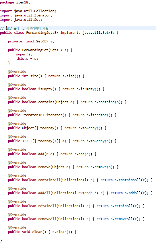 예제에서는 Set interface가 Component의 역할, HashSet이 ConcreteComponent, ForwardingSet이 Decorator, InstrumentedSet이 ConcreteDecorator