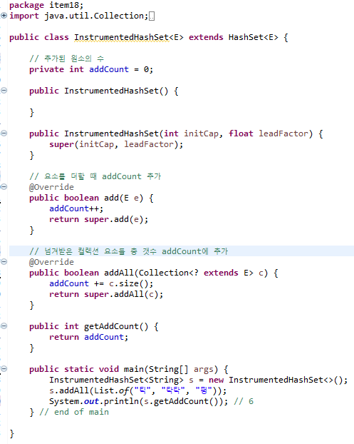 그리고 만약 상위 클래스에서 HashSet에 원소를 추가하는 또다른 메서드가 생겼을 경우 해당 메서드도 오버라이딩 하여 원소 갯수가 몇 개 추가됐는지 로직 구현을 해야하는데 우리가 상위 클래스에 그런 또다른 메서드가 생겼는지 알기는 매우 어려운 일이다.