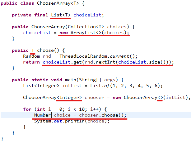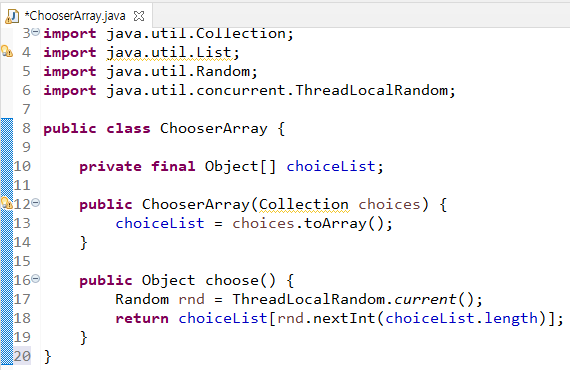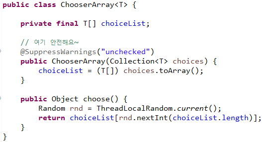 생성자에서 컬렉션을 받는 이 클래스는 컬렉션 안의 원소 중 하나를 무작위로 선택해 반환하는 choose 메서드를 제공한다.