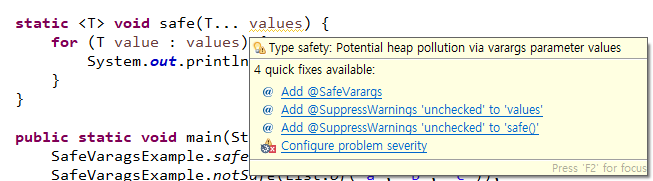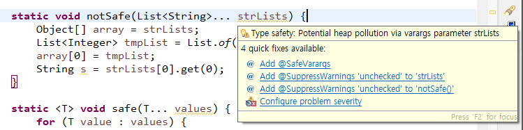 제네릭 타입으로 가변인자를 만들었으니 그런데 메서드 내부에서 하는 작업은 배열이 오염이 된다거나 형변환 관련 문제가 발생할 여지가 없는 안전한 코드이다.