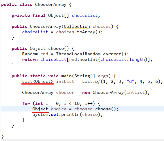 물론 받을 때 Object 로 받으면 모든 타입을 출력할 수 있어서 역시 문제가 안되지만 클래스 자체는 Object 배열로 만들어 어떠한 객체든 컬렉션을 담아서 담긴 배열의 값을 랜덤하게 출력하는 범용적인 역할을 하는 클래스이고