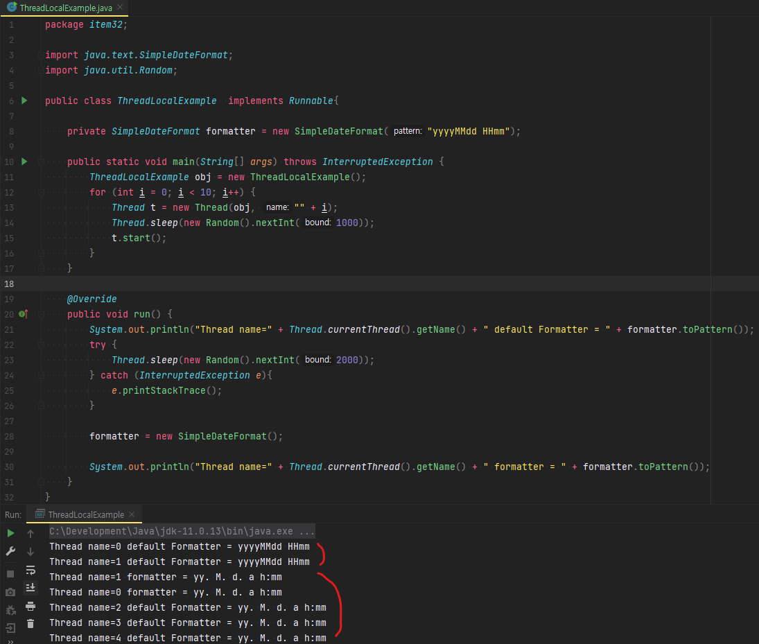 SimpleDateFormat 객체는 Thread Safe 하지 않은 객체로 원하는 날짜 형식을 지정하여 사용하던 중 누군가 중간에 기본 날짜 형식으로 변경한다면 작업이 다 끝나기 전에 형식이 달라지는 일이 발생하여 원하지 않는 날짜 데이터가 된다.