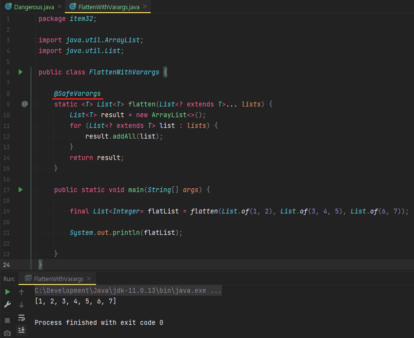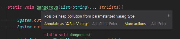 그래서 제네릭 가변인자 매개변수를 받는 메서드는 컴파일 에러는 아니지만 비검사 경고가 뜨는데 메서드가 타입 안전성을 보장한다면 @SafeVarargs를 사용하여 비검사 경고를 없에는 방법을 제공한다.