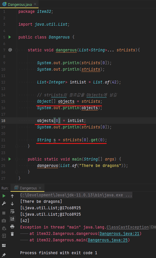 이처럼 런타임에 타입 안전성이 깨지니 제네릭 varargs 배열 매개변수에 값을 저장하는 것은 안전하지 않다.