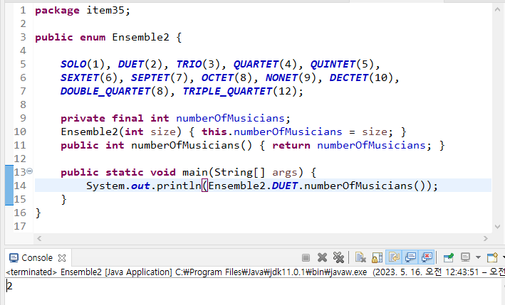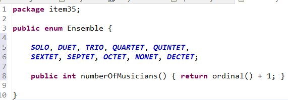 이 앙상블 열거타입은 합주단의 종류를 열거한 타입으로, 해당하는 상수의 연주자가 몇 명인지 알기위해 ordinal 메서드를 사용하였다.
