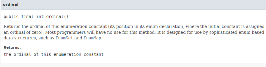 하지만 대부분 프로그래머가 ordinal 메서드를 사용하는 일은 없고 EnumSet이나 EnumMap 같이 열거 타입 기반의 범용 자료구조에 사용될 목적으로 만들어진 메서드이다.